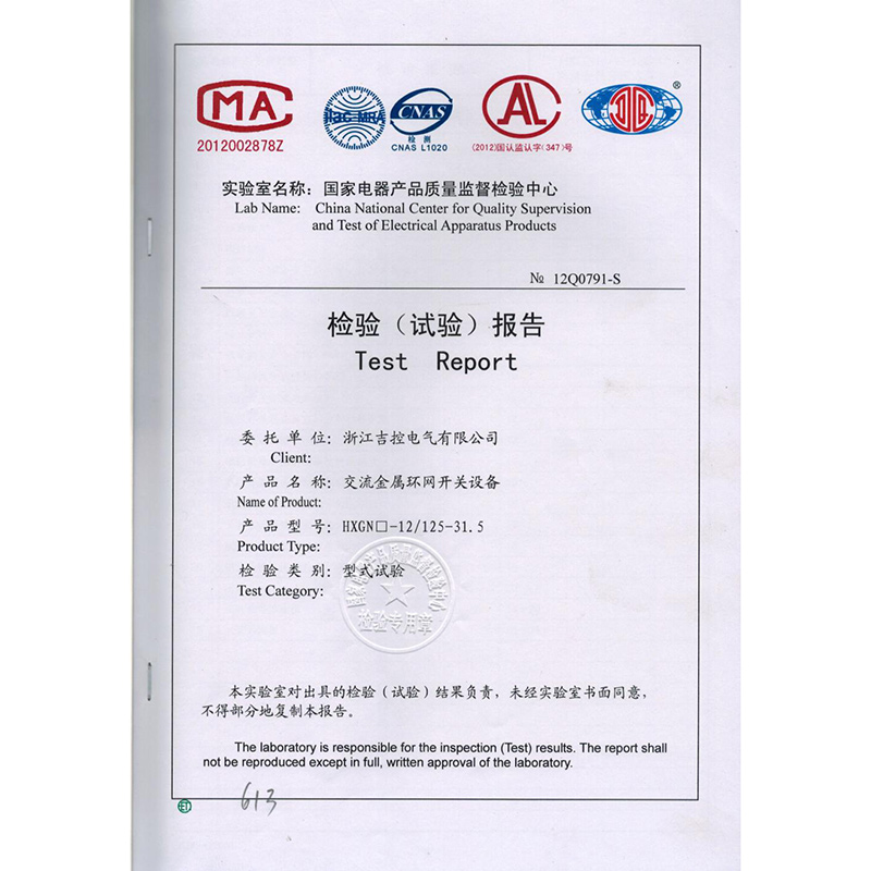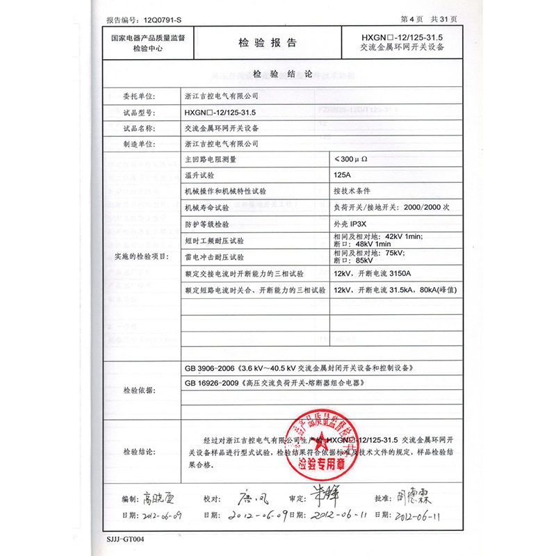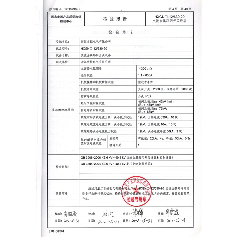 戶內交流箱型固定式金屬封閉開關設備檢驗報告